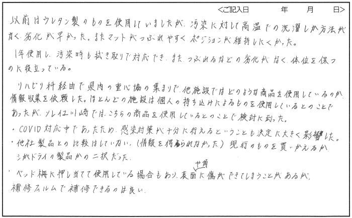 「1年間使用し、汚染時も拭き取りで対応でき、また、つぶれるなどの劣化がなく、体位を保つのに役立っている」