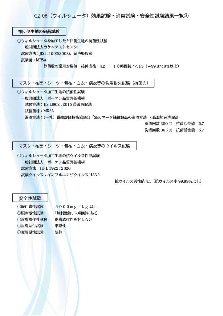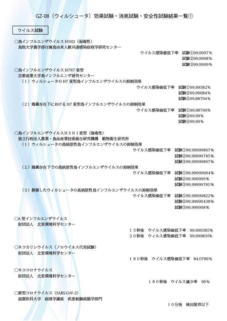 GZ-08(ウィルシュータ)効果試験・消臭試験・安全性試験結果一覧