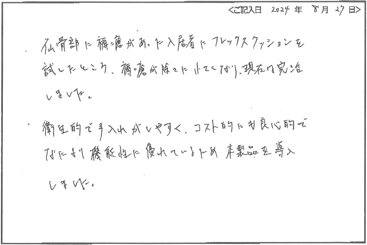 「仙骨部に褥瘡があった入居者様にフレックスクッションを試したところ、褥瘡が徐々に小さくなり、現在は完治しました。」
