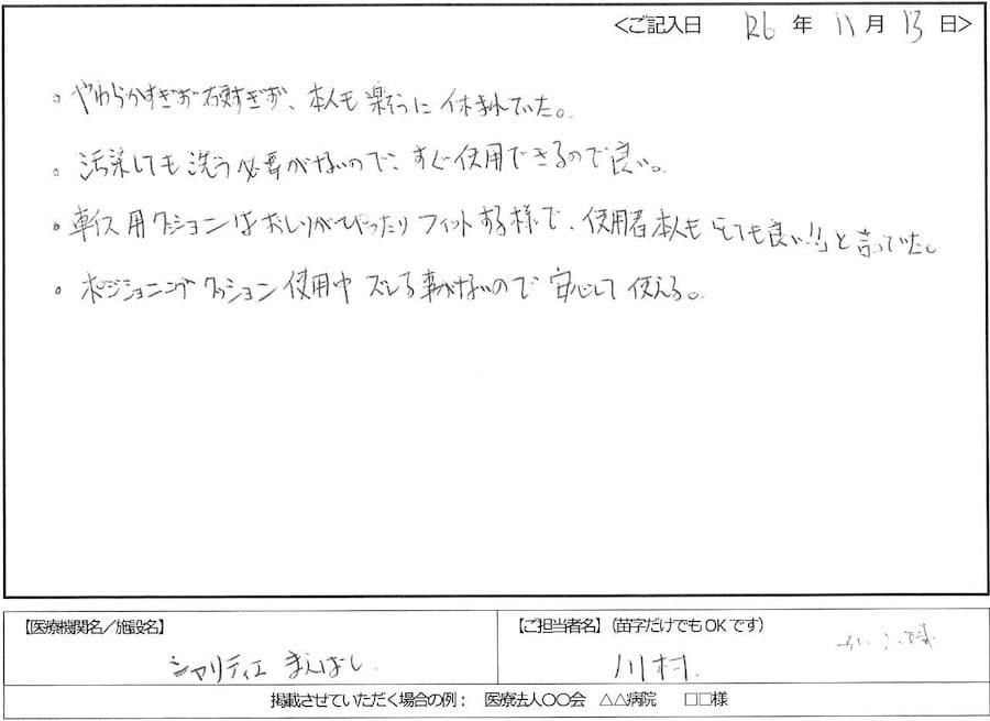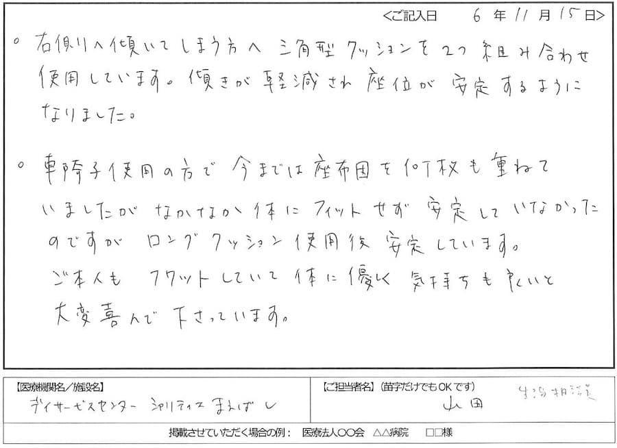 - 利用者様にクッションを使用していますが、使用前は、車椅子上で傾いたり、ベッド上でもきちんと体交ができていませんでしたが、今では、車椅子上でも姿勢が良かったり、体交もしっかりと出来るようになったので使用して良かったです。
