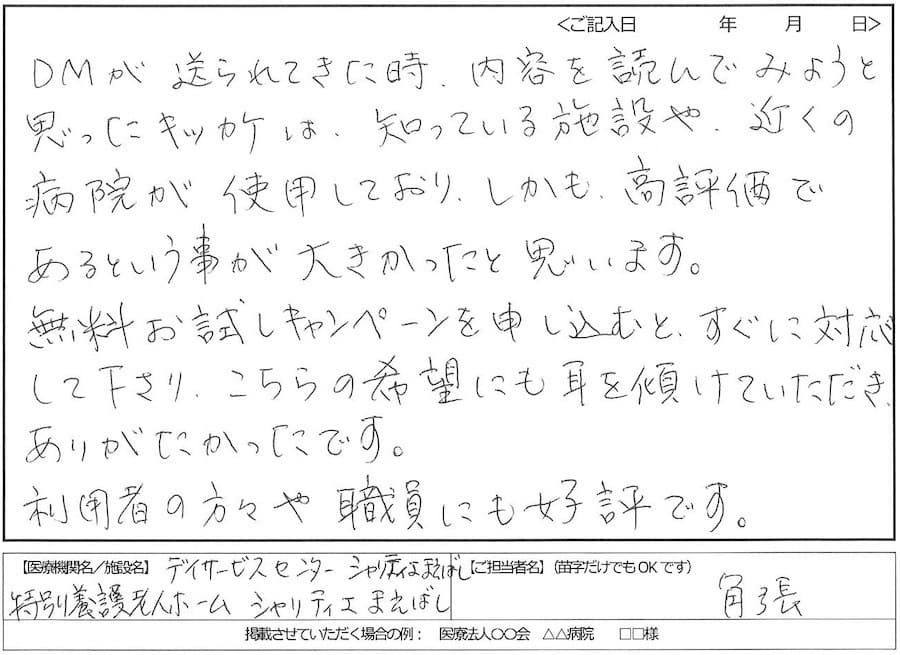 - DMが送られてきた時に、内容を読んでみようと思ったキッカケは、知っている施設や、近くの病院が使用しており、しかも、高評価であるという事が大きかったと思います。