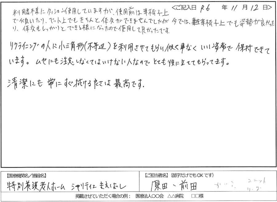 - リクライニングの人に小三角型(不等辺)を利用させてもらい傾くことなく、良い姿勢で保持できています。ムセにも注意をしなくてはいけない利用者様なので、とても役立っています。