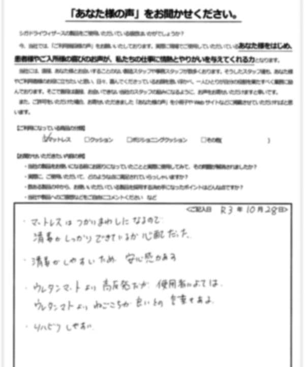 「皮膚・排泄ケア認定看護師」(WOC)のA.K様から、実際にご利用いただいている「体圧分散マットレス スーパーフレックス AXシリーズ」についてのご意見をいただきました。