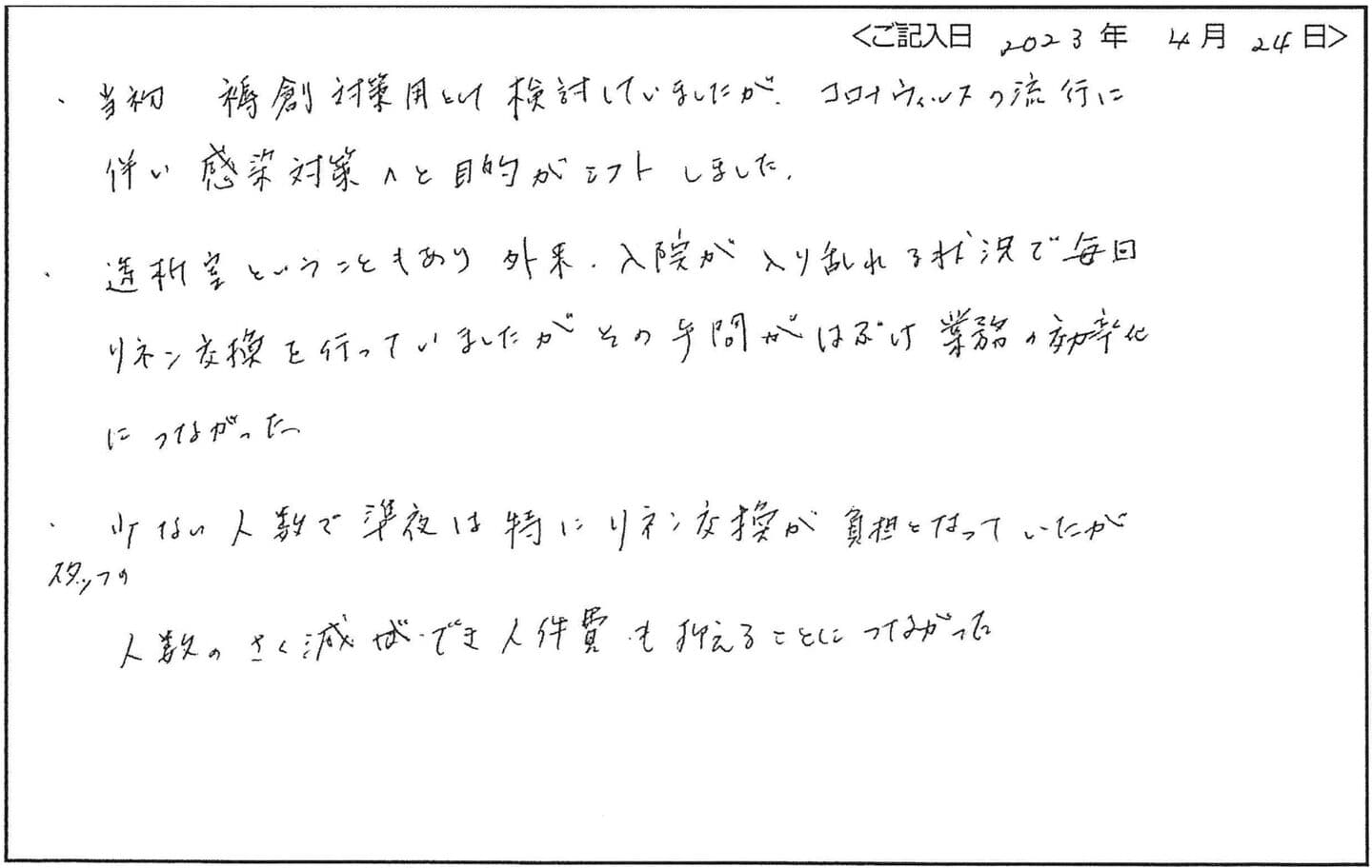 - スタッフの少ない人数で準夜は特にリネン交換が負担となっていたが、人数の削減ができ、人件費も抑えることにつながりました。