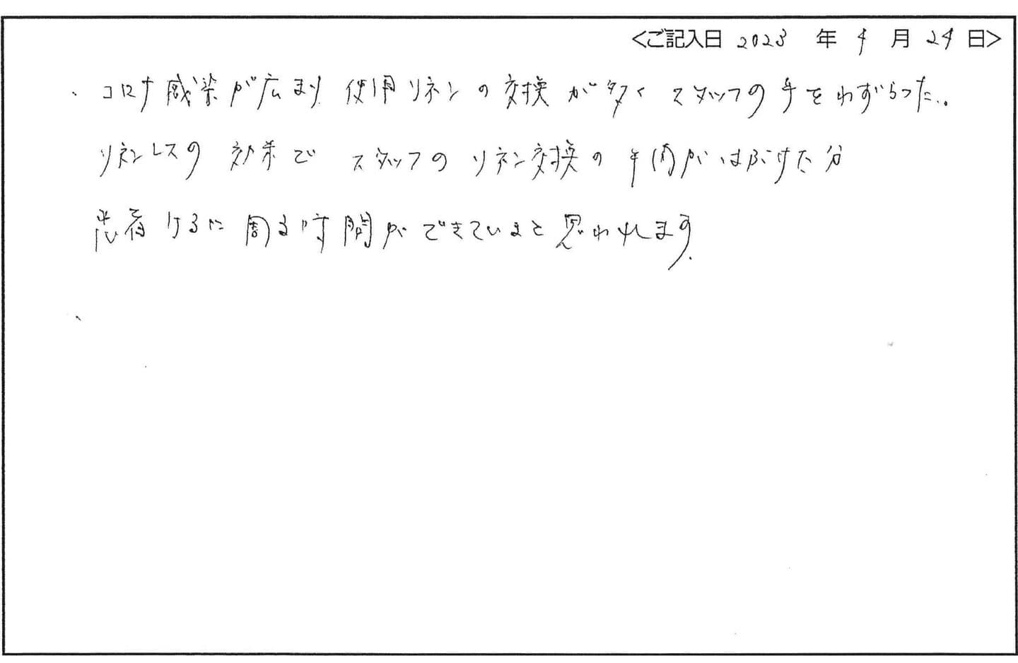 - コロナ感染が広まり、使用リネンの交換が多く、スタッフの手を煩わせていました。
