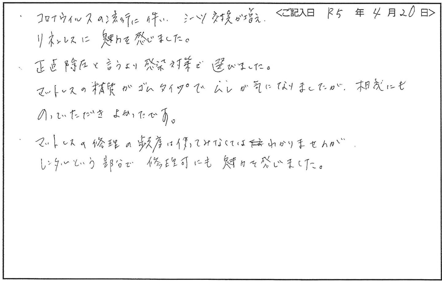 - マットレスの材質がゴムタイプでムレが気になりましたが、相談にものっていただきよかったです。