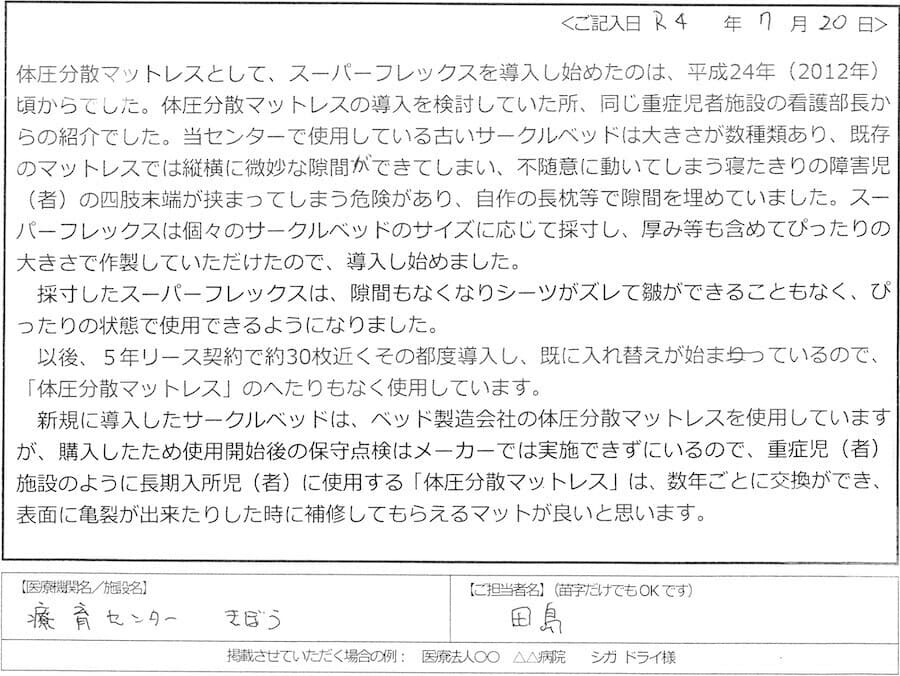 新規に導入したサークルベッドは、ベッド製造会社の体圧分散マットレスを使用していますが、購入したため、使用開始後の保守点検はメーカーでは実施できずにいるので、重症児(者)施設のように長期入所児(者)に使用する「体圧分散マットレス」は数年ごとに交換ができ、表面に亀裂が出来たりした時に補修してもらえるマットレスが良いと思います。