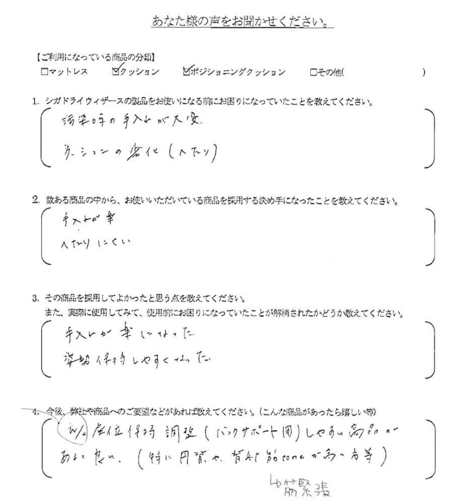 - 車椅子の座位保持調整(バックサポート用)しやすい商品があると良い。(特に円背や背部、筋緊張が高い方等)