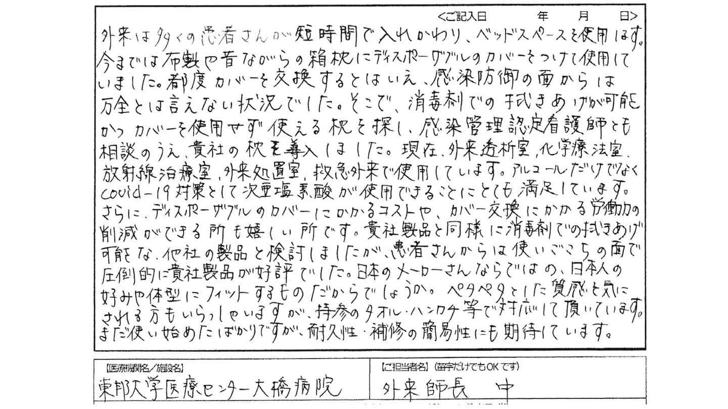「消毒剤での拭きあげが可能かつカバーを使用せずに使える“枕”を探し、感染管理認定看護師とも相談の上、導入しました。アルコールだけでなく、covid-19対策として次亜塩素酸が使用できることにとても満足しています。」