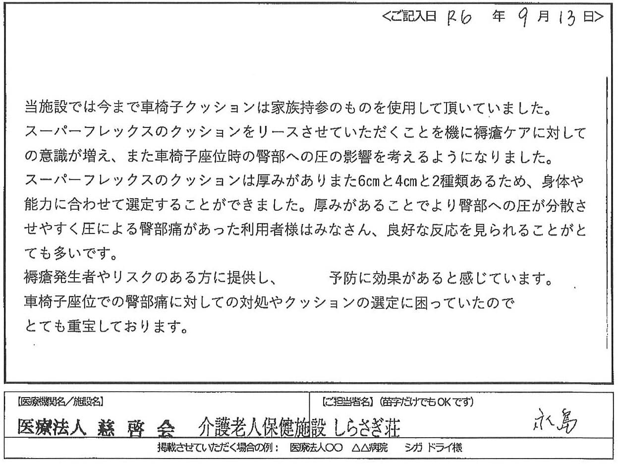「介護老人保健施設 しらさぎ荘」様には2022年4月より「車椅子用フレックスクッション(4㎝厚/6㎝厚)」、さらに2024年4月より「スーパーフレックスAXシリーズ」をご利用いただいております。