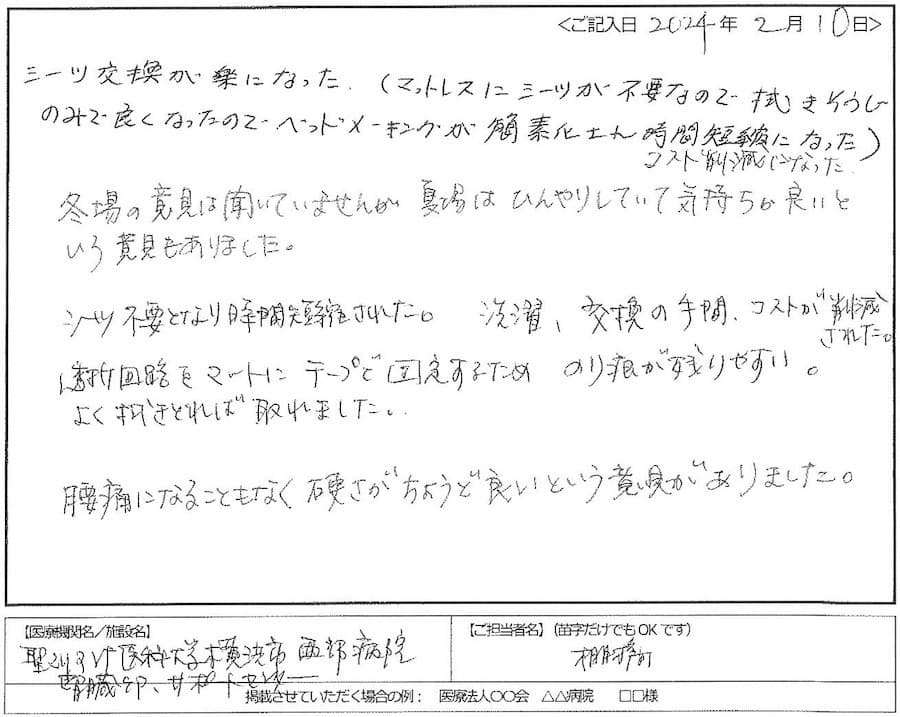 - シーツ交換が楽になった(マットレスにシーツが不要で、清拭のみでよくなったので、ベッドメイキングが簡素化され時間短縮になった。)