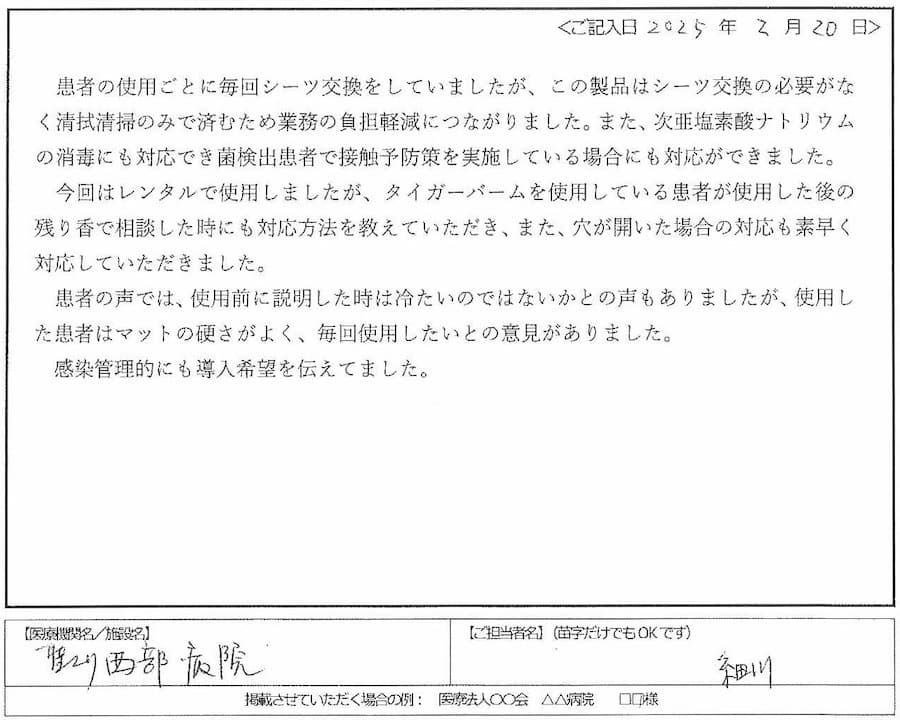 - 患者様の声では、使用前に説明した時は冷たいのではないかとの声もありましたが、使用した患者様は、マットレスの硬さがちょうどよかったみたいで、毎回使用したいと言っていました。