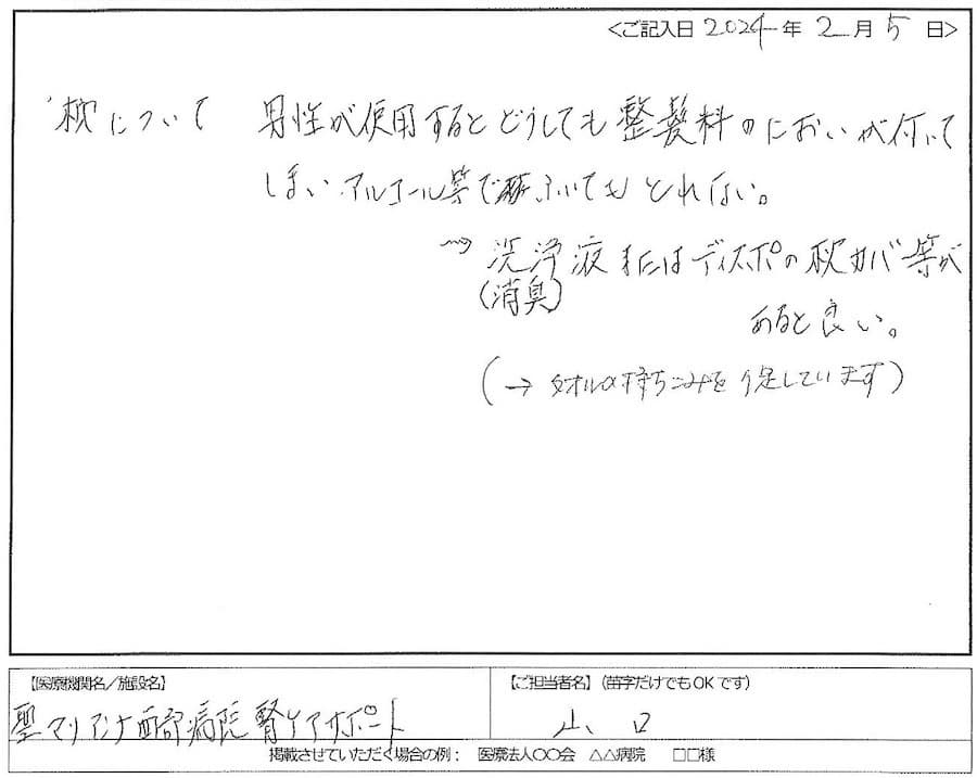 - リネンレスの検証中に、香りのつよい軟膏や整髪料をつけている患者様が、使用した“枕”に残った“におい”について相談した時にも、対応方法を教えていただき助かりました。