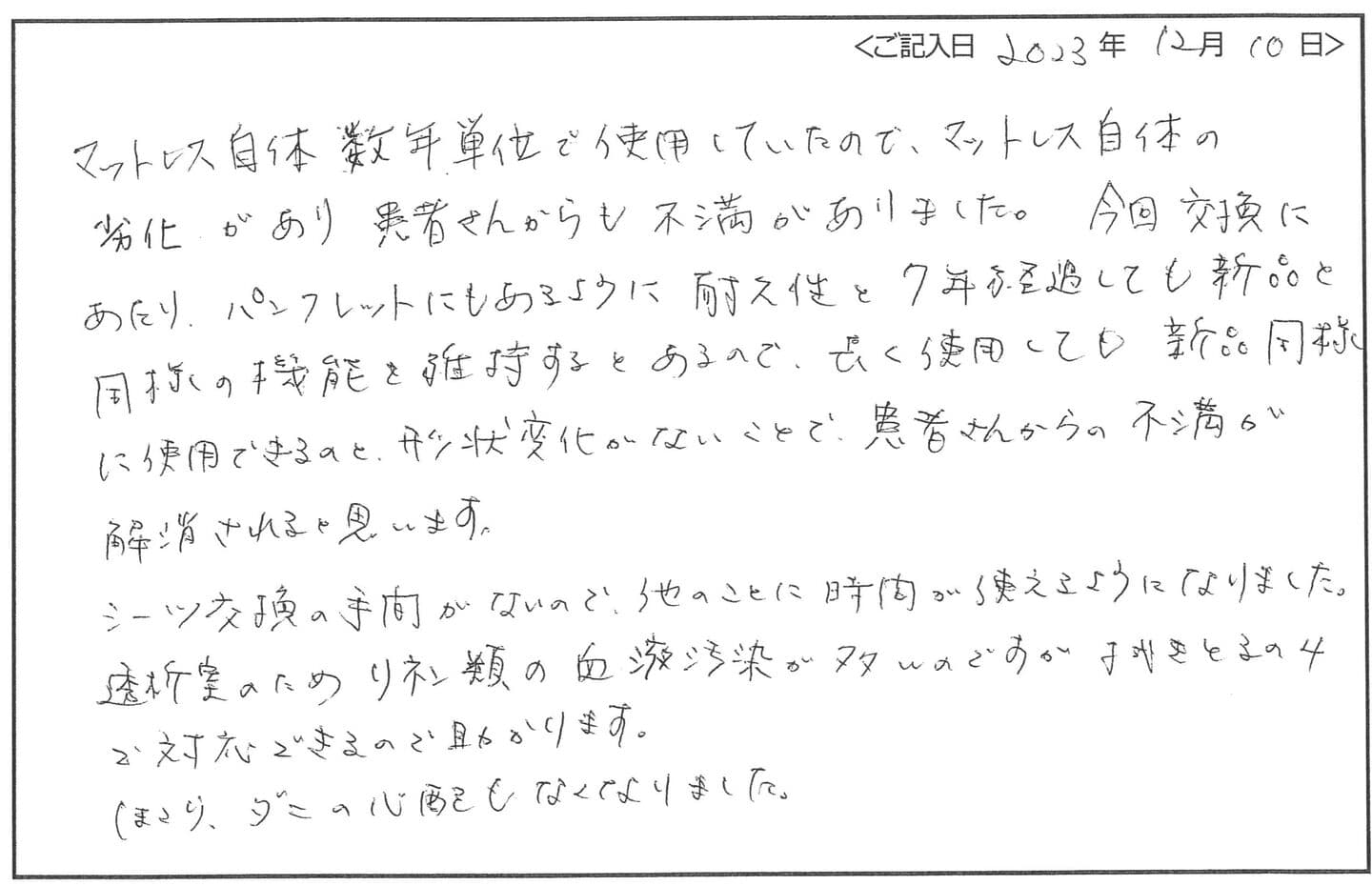 - マットレス自体、数年単位で使用していたので、マットレス自体の劣化があり、患者様からも不満がありました。今回、交換にあたり、パンフレットにもあるように耐久性と7年経過しても新品と同様の機能を維持するとあるので、長く使用しても新品同様に使用できるのと、形状変化がないことで、患者様からの不満が解消されると思います。