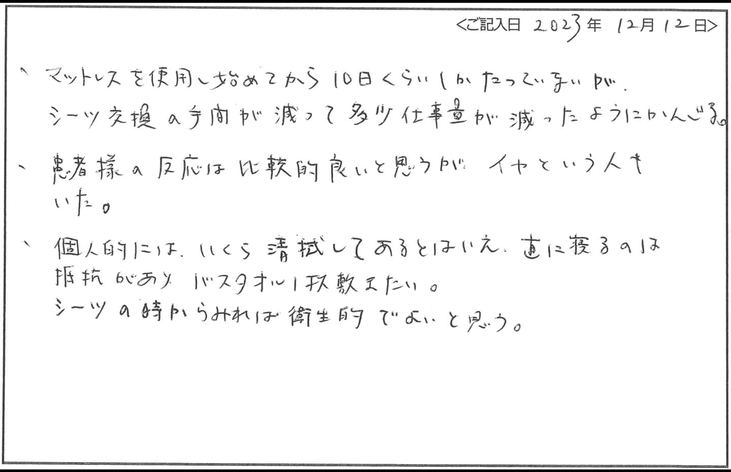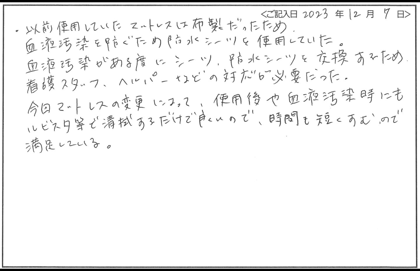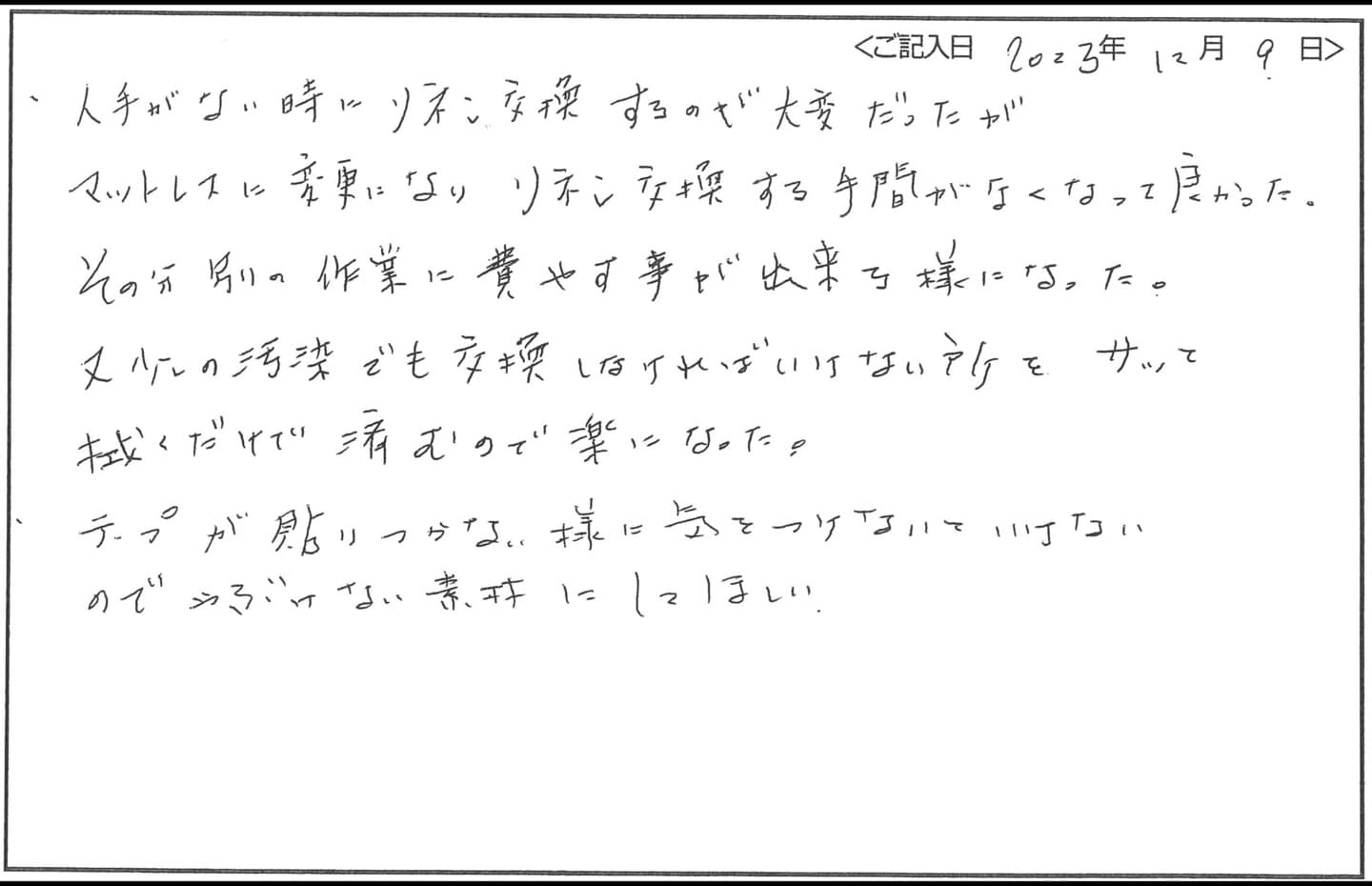 - シーツ交換がなく、業務改善になりました。