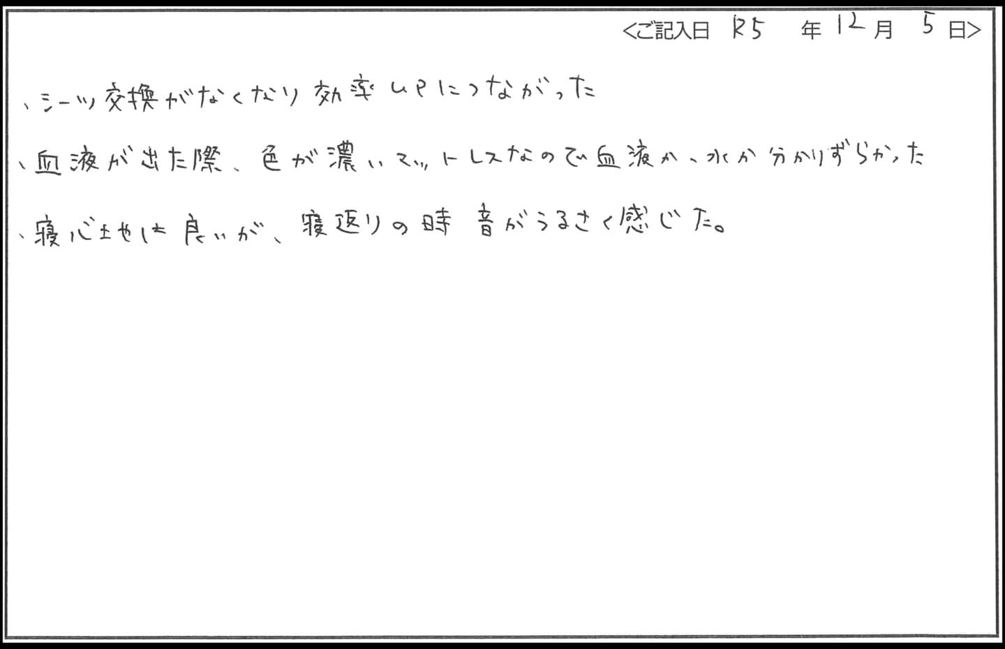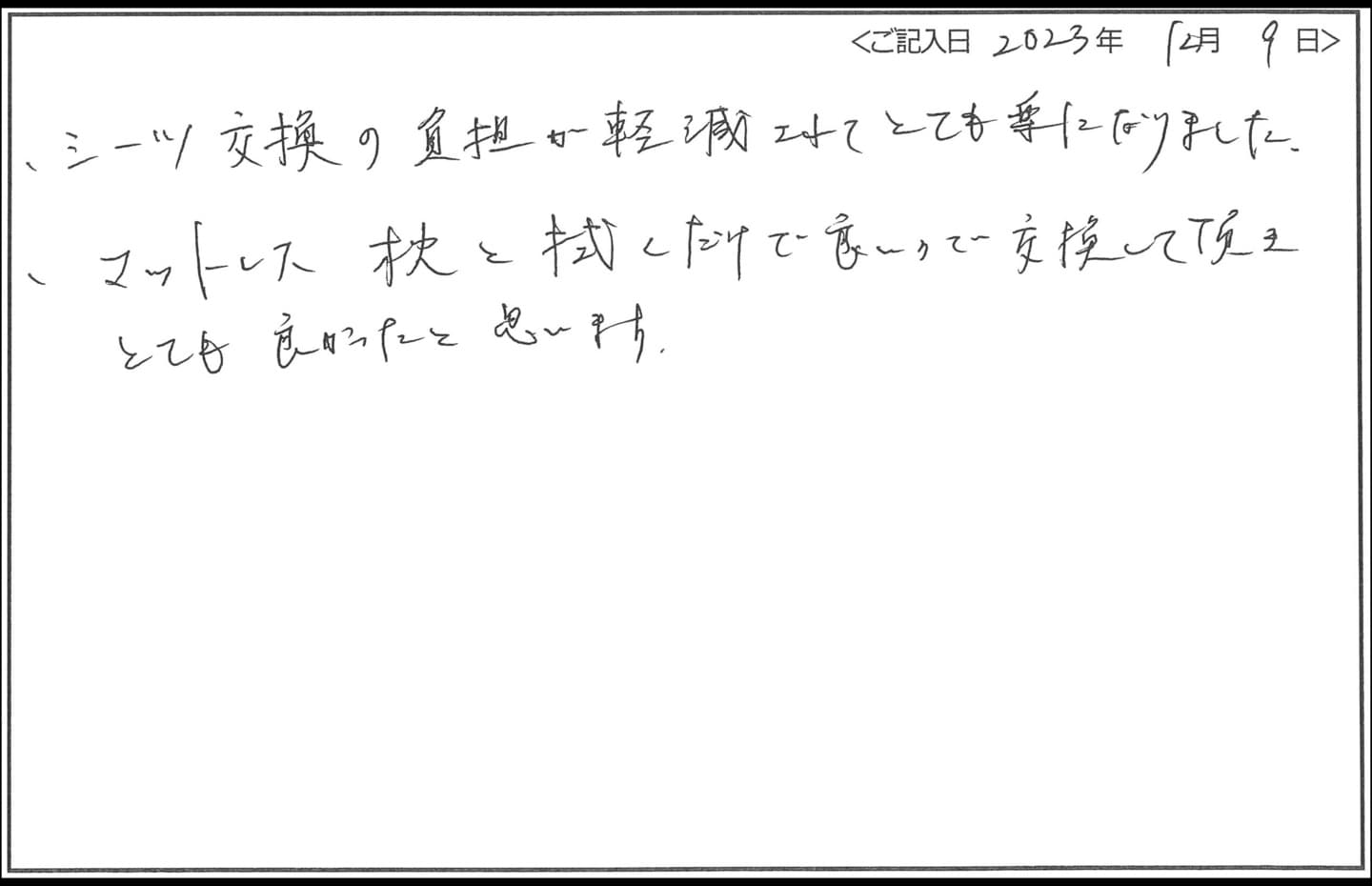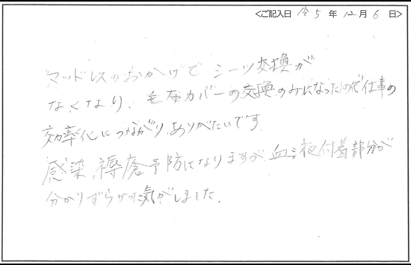 - シーツ交換がなく、業務改善になりました。