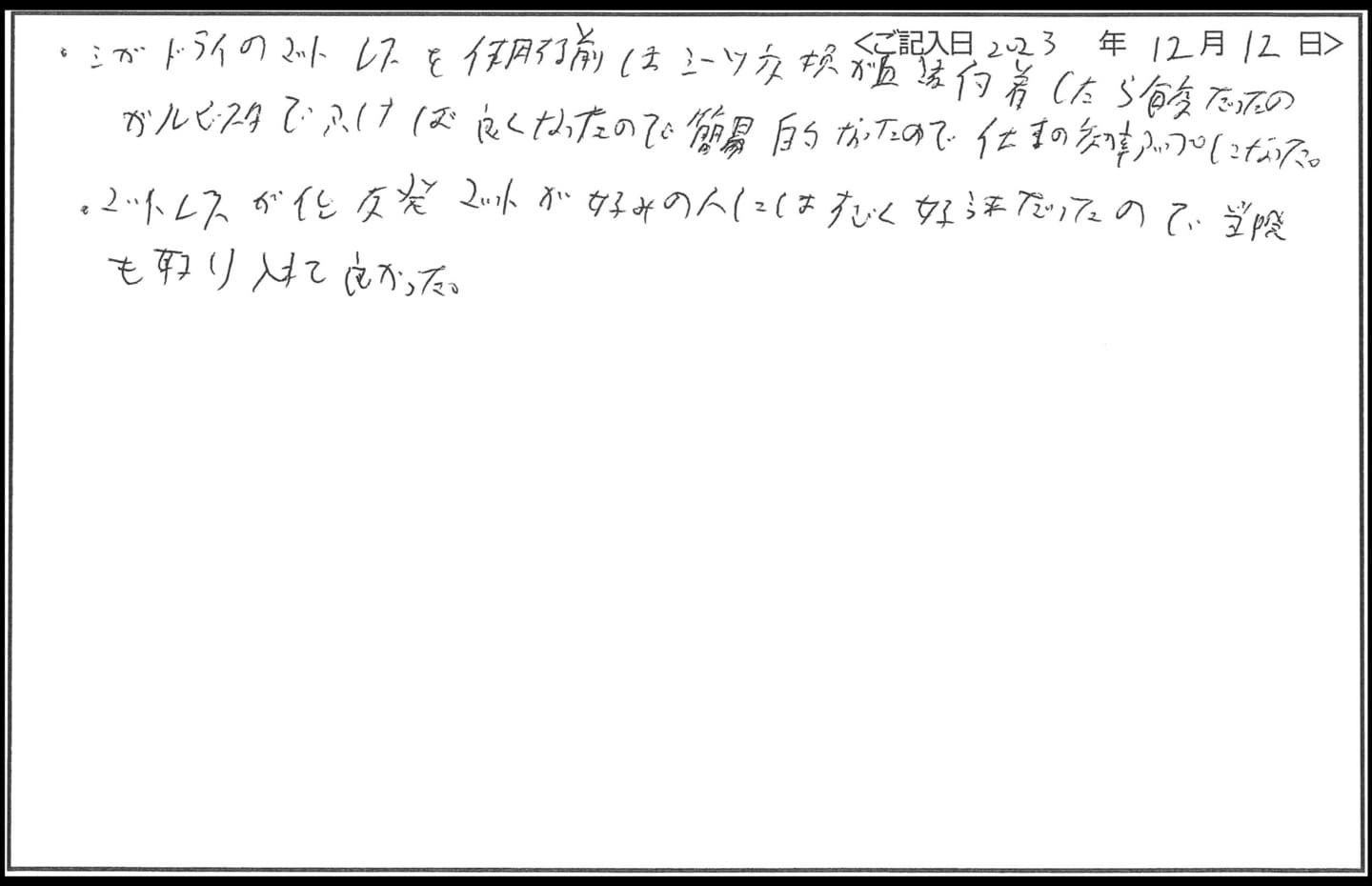 - マットレス、マクラと拭くだけでよいので、交換していただきとても良かったと思います。