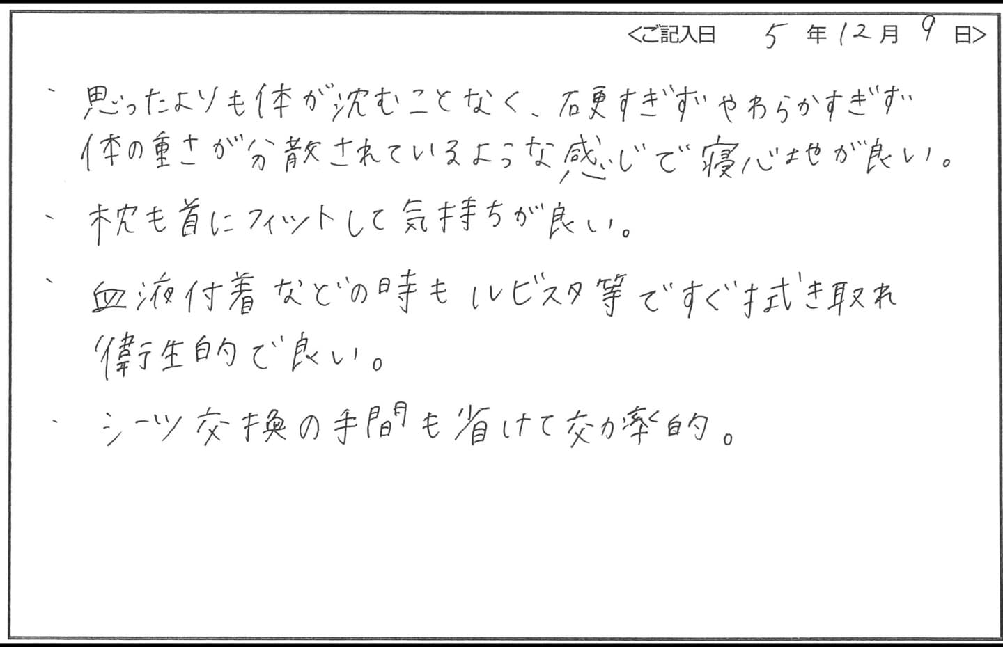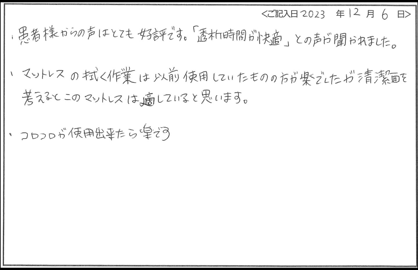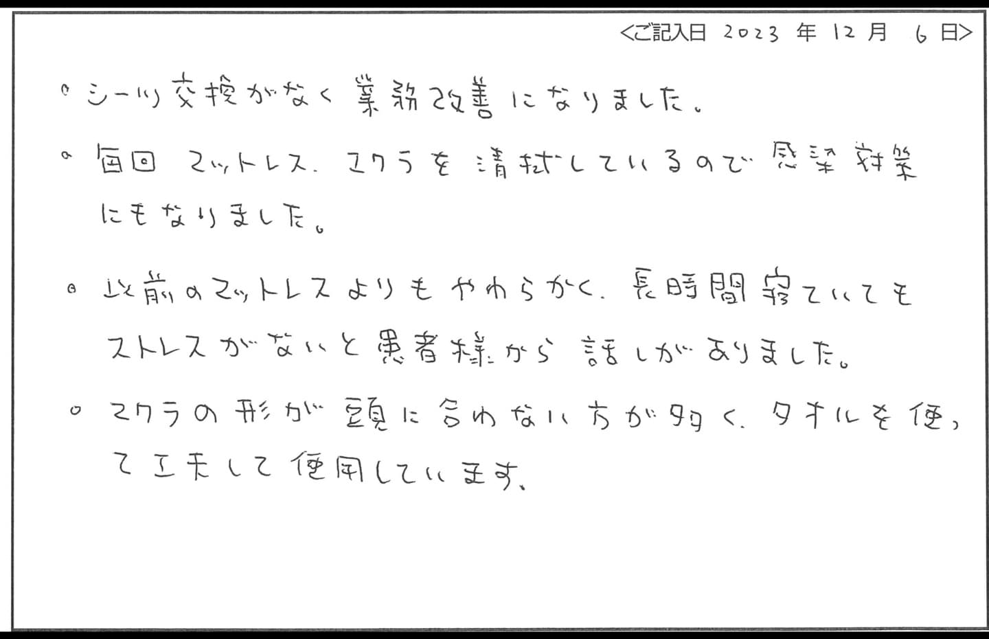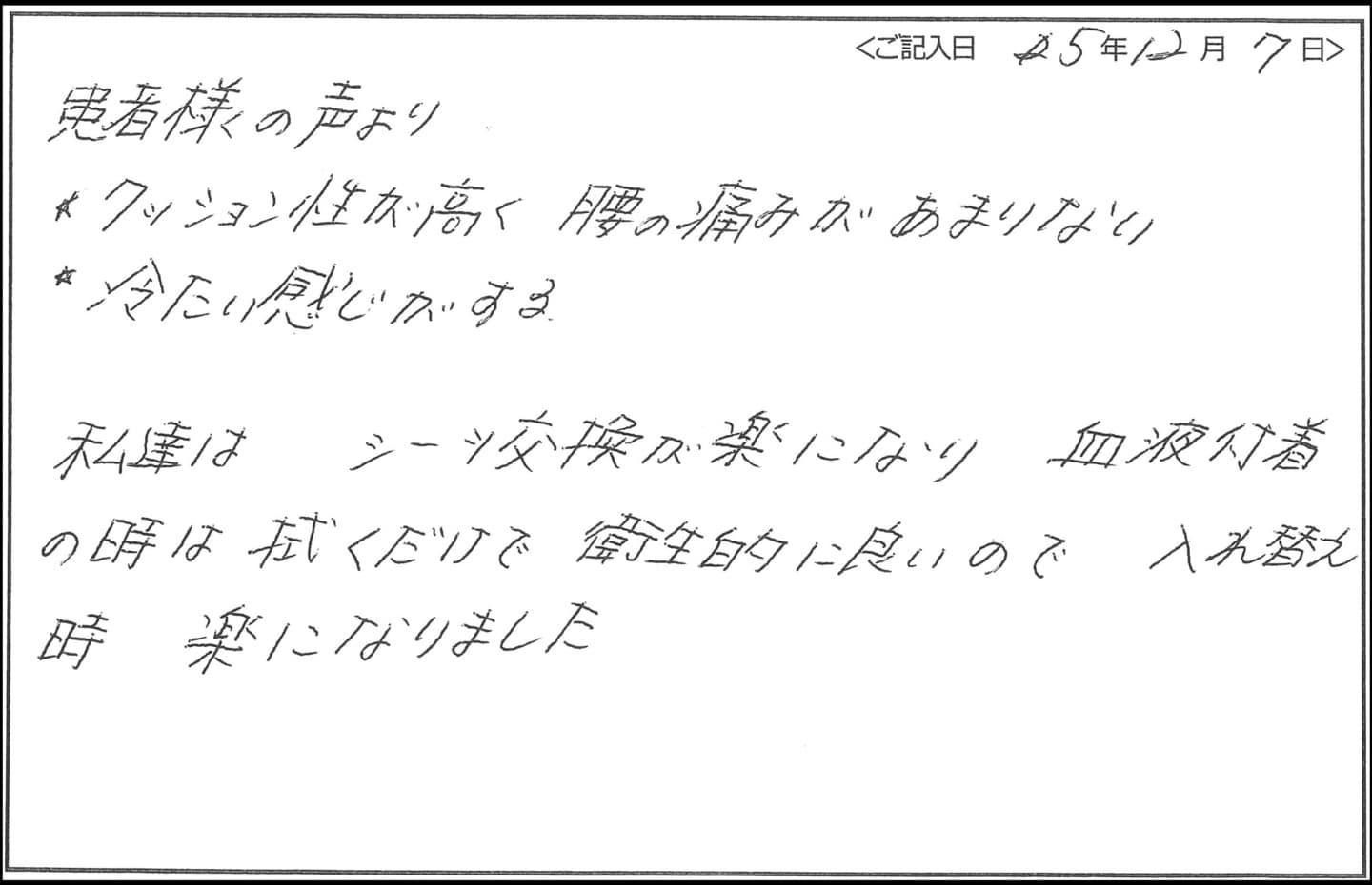 - “以前のマットレスよりも柔らかく、長時間、寝ていてもストレスがない” と患者様から話がありました。