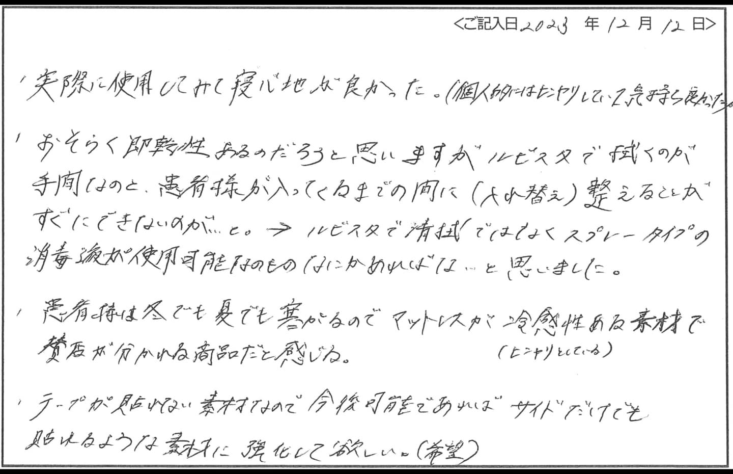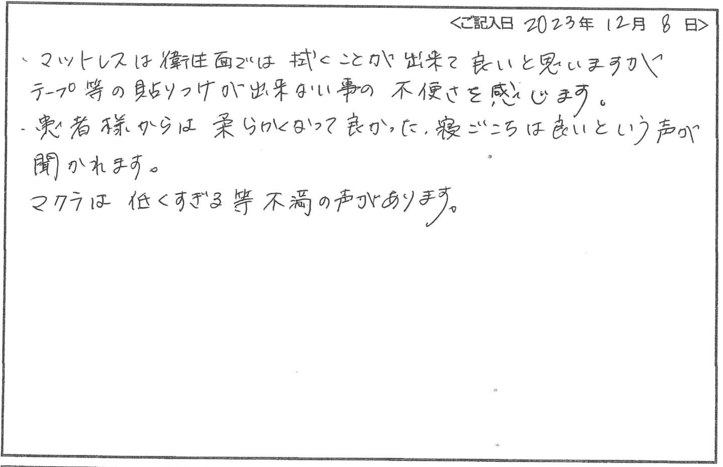 - 患者様は冬でも夏でも寒がるので、マットレスが冷感性(ヒンヤリとしている)ある素材で賛否が分かれる商品だと感じる。