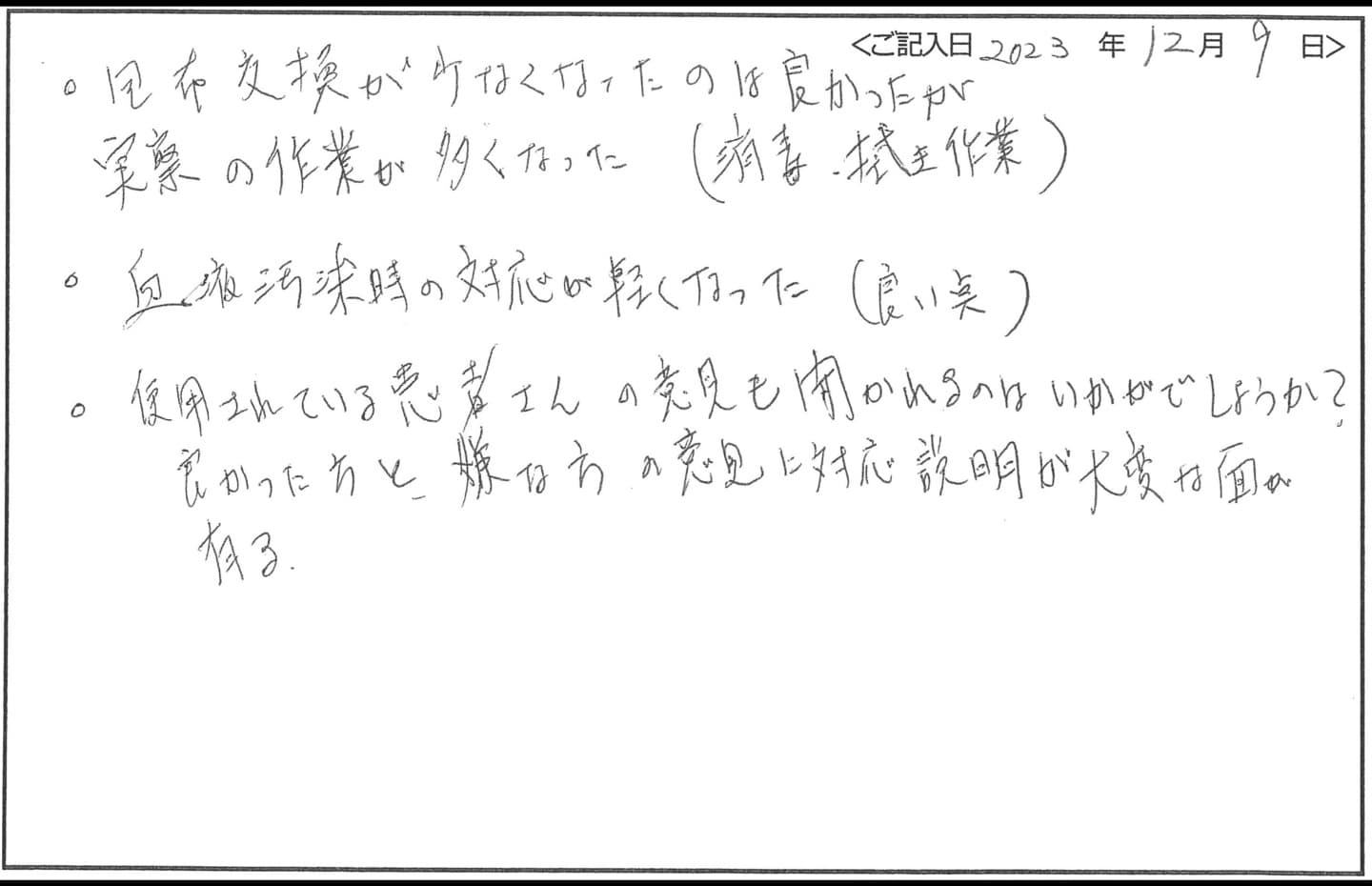 - 包布交換が少なくなったのは良かったが、実際の作業が多くなった(消毒、拭き作業)