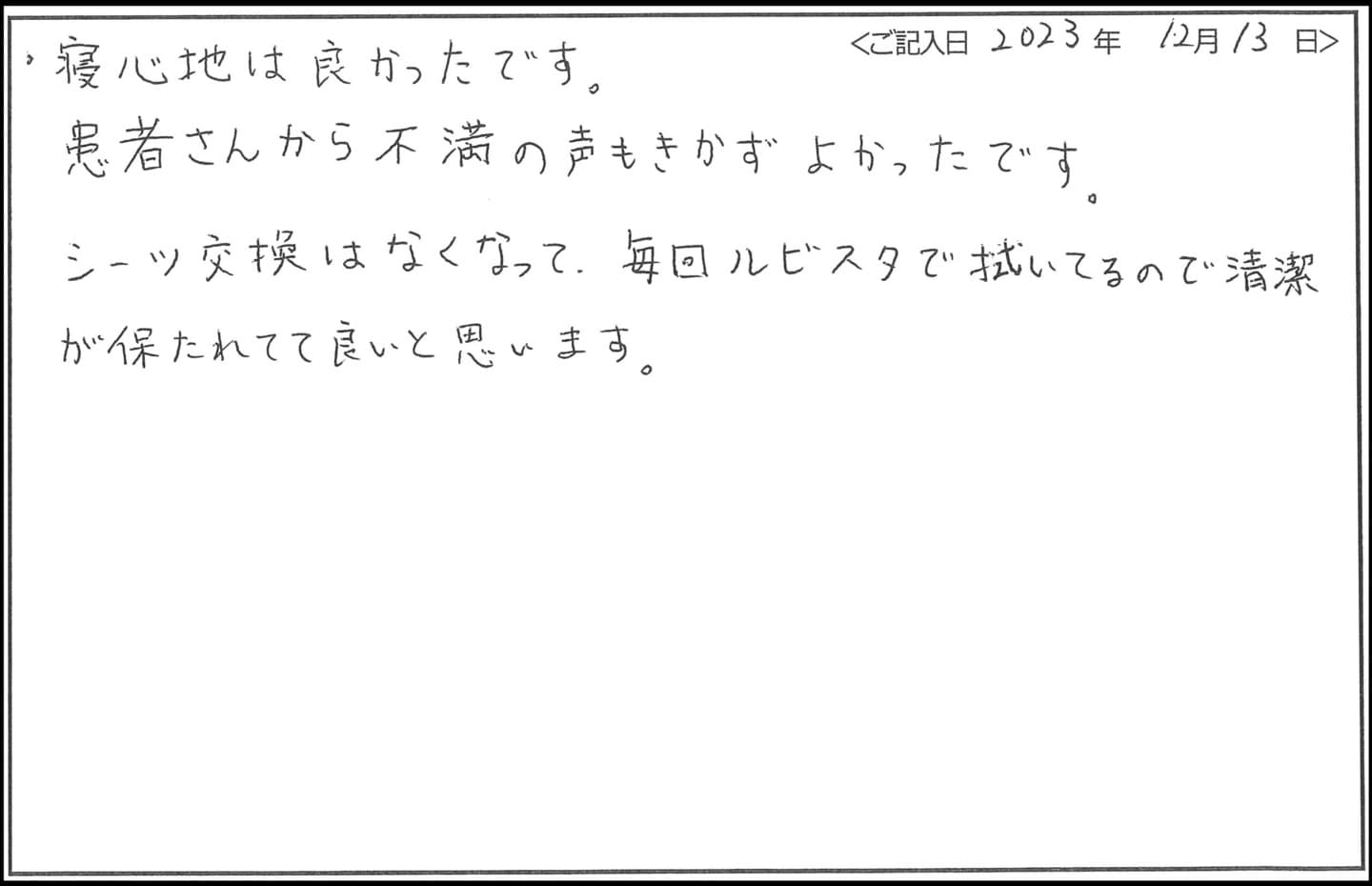 - 寝心地は良かったです。患者様からの不満の声も聞かず、よかったです。