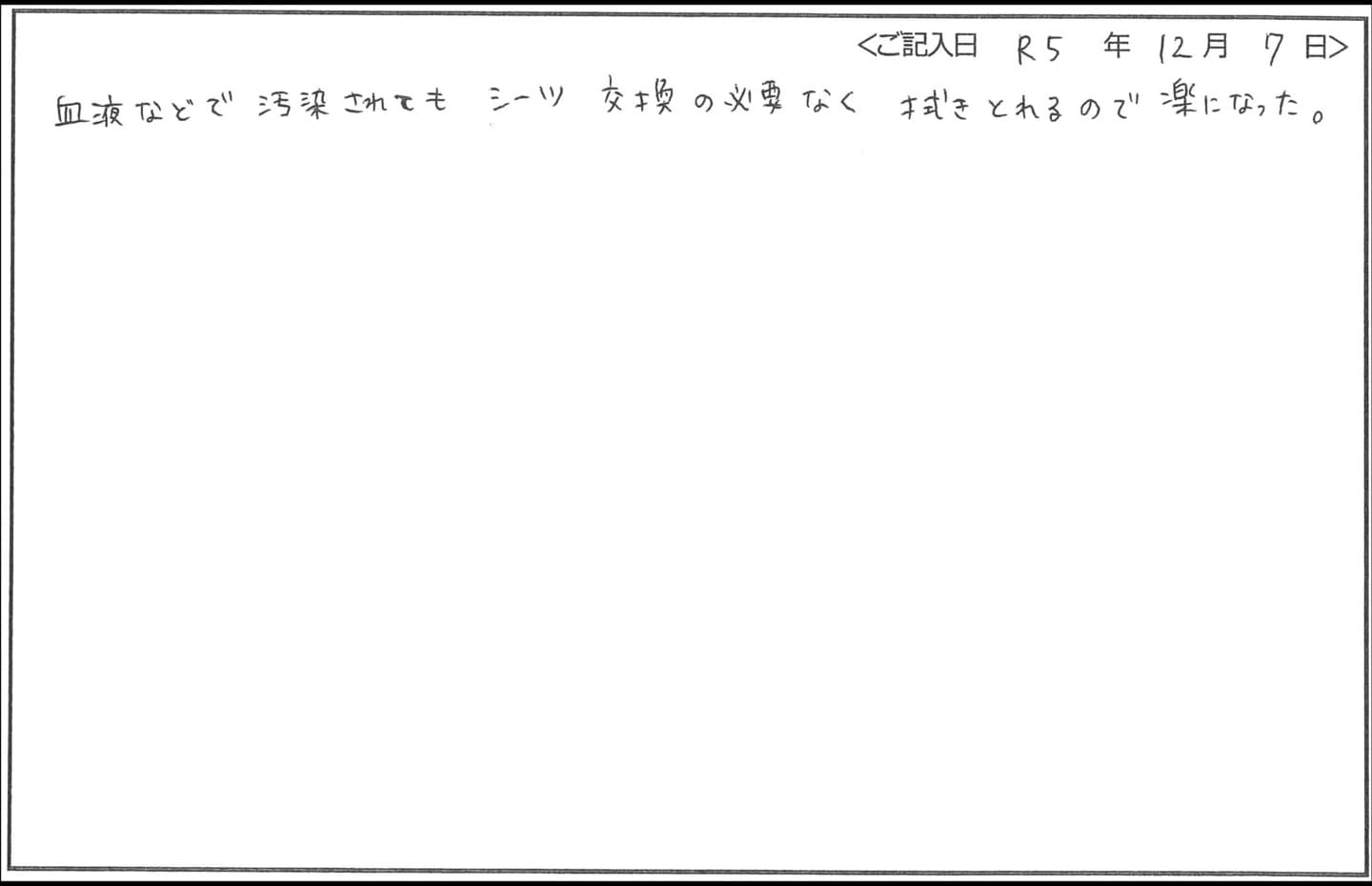 - 私たちはシーツ交換が楽になり、血液付着の時は拭くだけで衛生的によいので、入れ替え時、楽になりました。