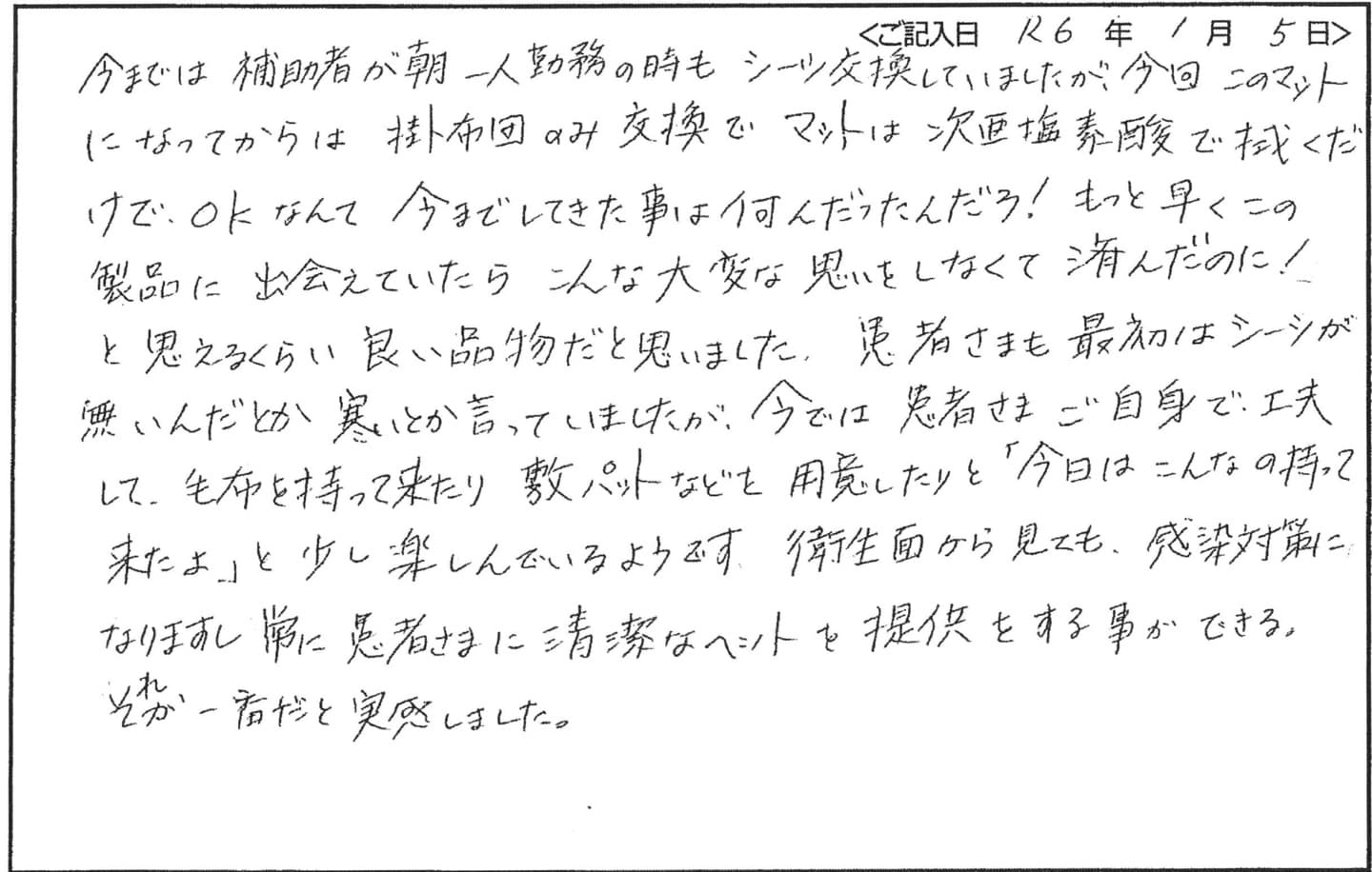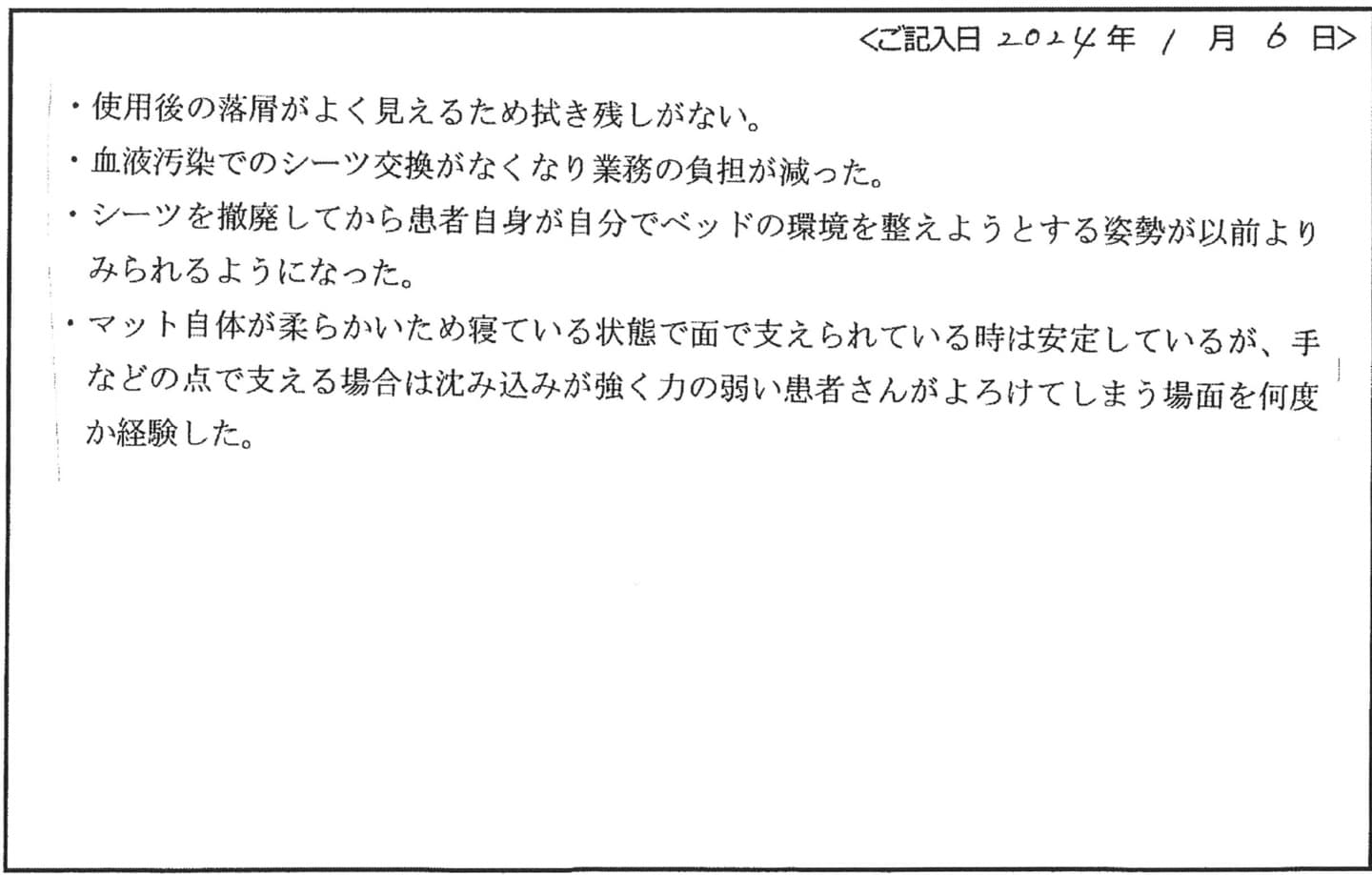 - 朝の勤務帯では、看護補助者が一人でシーツ交換を行うこともあり、シーツ交換が掛布団だけになったことや、マットレスを次亜塩素酸で拭くだけでOKになったことで、業務負担は大きく削減されました。「今までしてきたことは何だったのだろう!もっと早くこの製品に出会えていたら大変な業務をしなくて済んだのに!」と思えるくらいよい製品だと思いました。