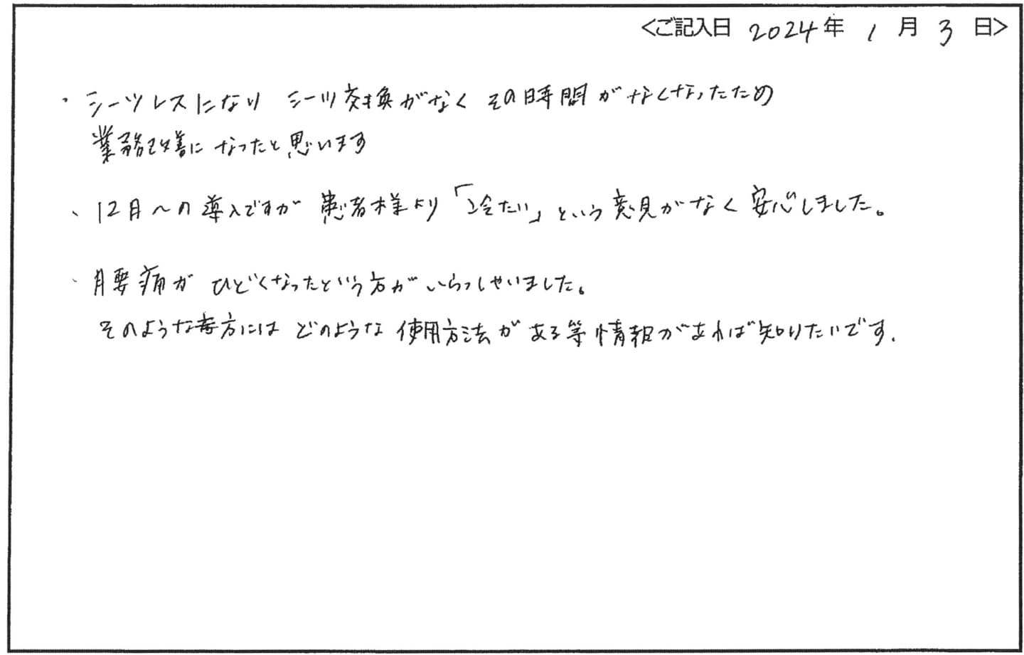 - (2023年)12月からの導入ですが、患者様より「冷たい」という意見がなく安心しました。