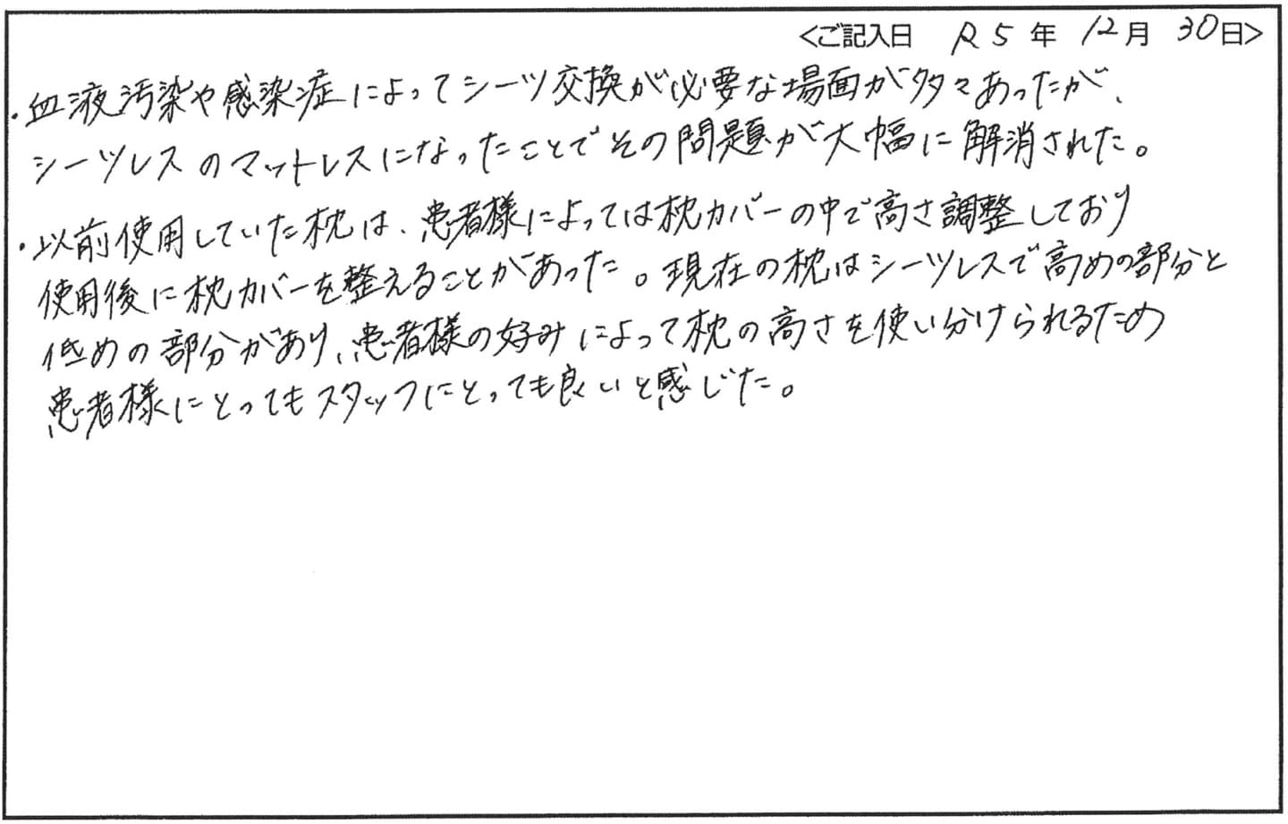 - 衛生面からみても、感染対策になりますし、常に患者様に清潔なベッドを提供することができる、それが一番だと感じました。