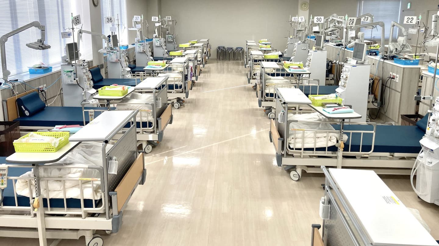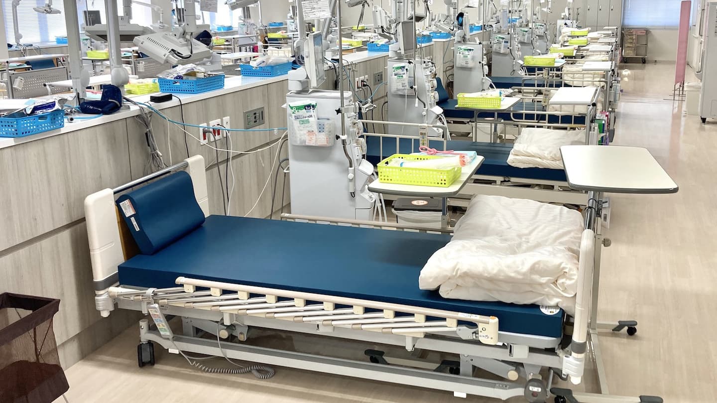 「善衆会病院」様では、“透析室”の全床(40床)、「スーパーフレックスAシリーズ(A85〔85ミリ厚〕」と「フレックスクッション ピロータイプ」を採用いただいております。「善衆会病院」様では、リネンの削減とスタッフの方の手間の削減のため、シーツと枕カバーを使わない“リネンレス”の環境でご使用して頂いております。