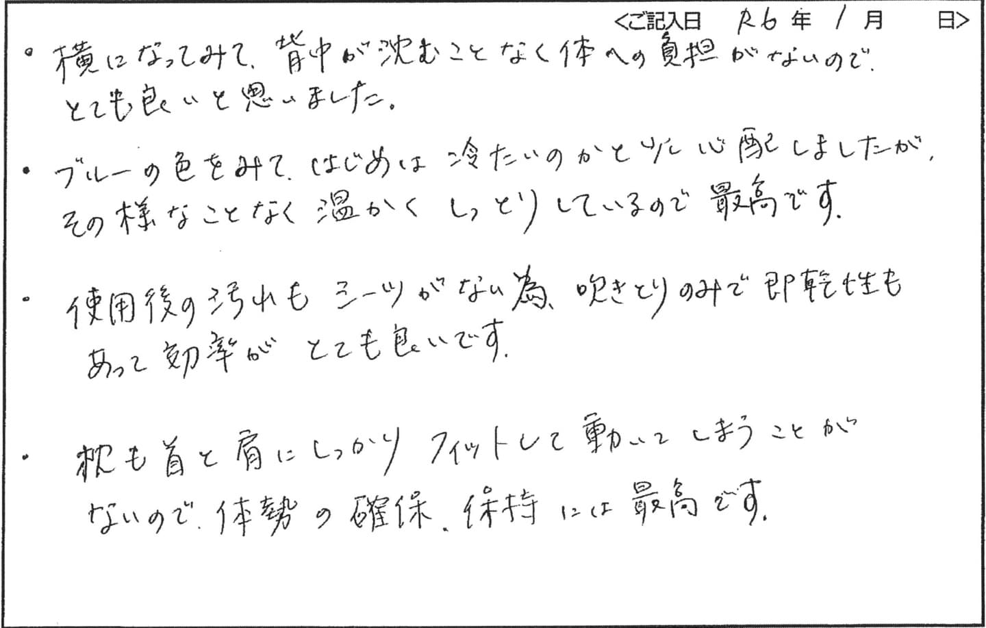 - 横になってみて、背中が沈むことなく、身体への負担がないので、とても良いと思いました。